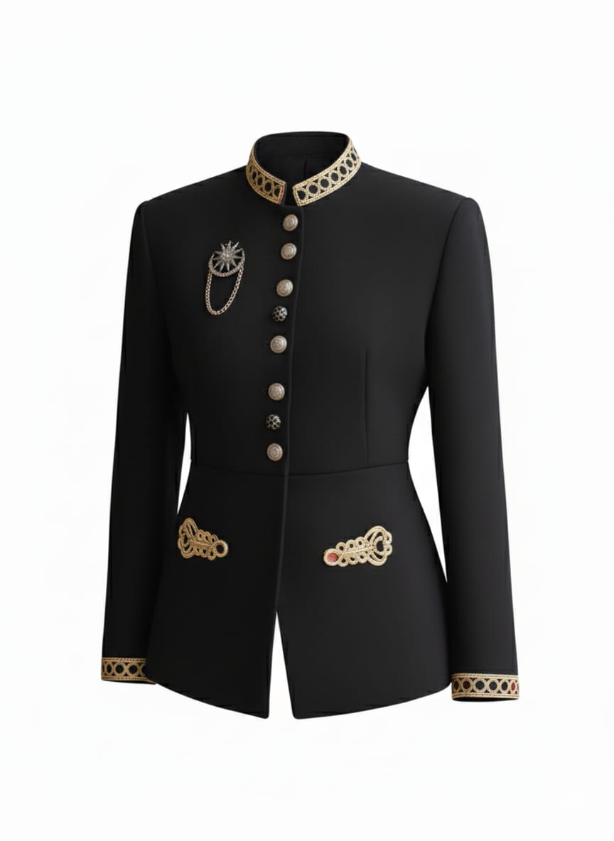 Una pieza que encarna el poder de lo simbólico y la sofisticación de lo eterno. La Chaqueta fusiona la estética militar con el lujo celestial: cuello alto bordado en oro, botones joya, y un broche estelar que evoca constelaciones protectoras. Cada detalle —desde los puños perlados hasta la cadena ornamental— está diseñado para empoderar, seducir y narrar una historia de renacimiento.
