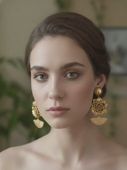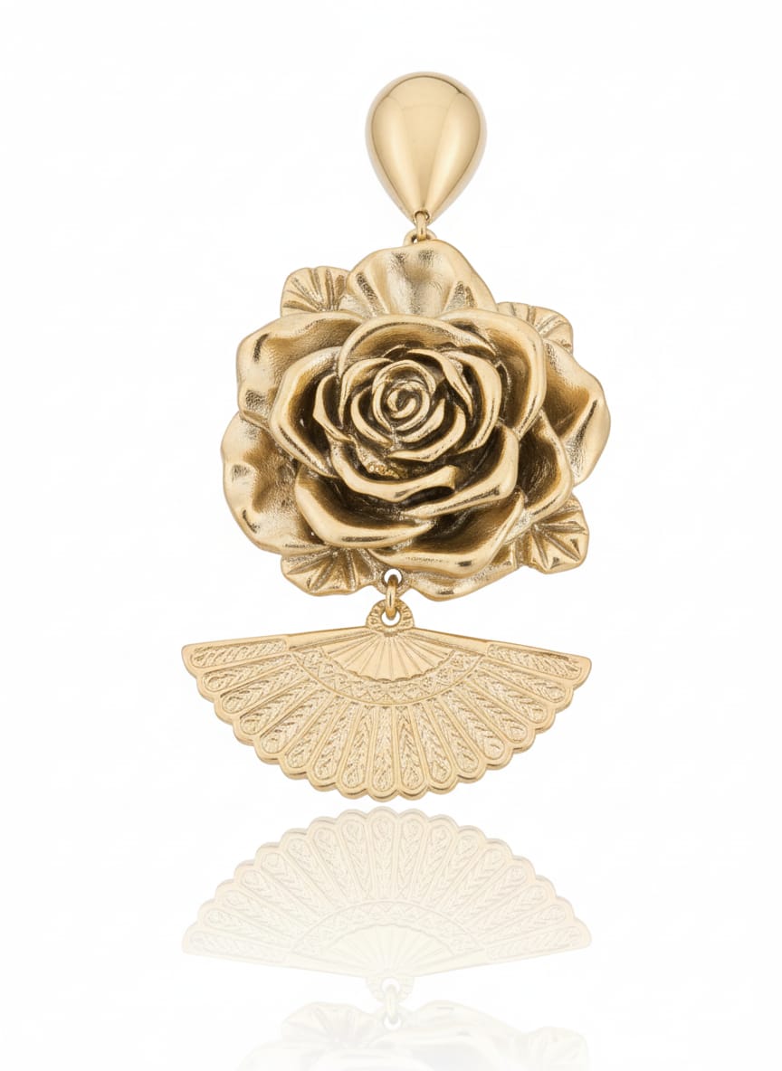 Una rosa dorada florece en el oído, y bajo ella, un abanico se despliega como un suspiro de fiesta. Los Pendientes son un homenaje a la mujer que se convierte en escenario: poderosa, luminosa, inolvidable.