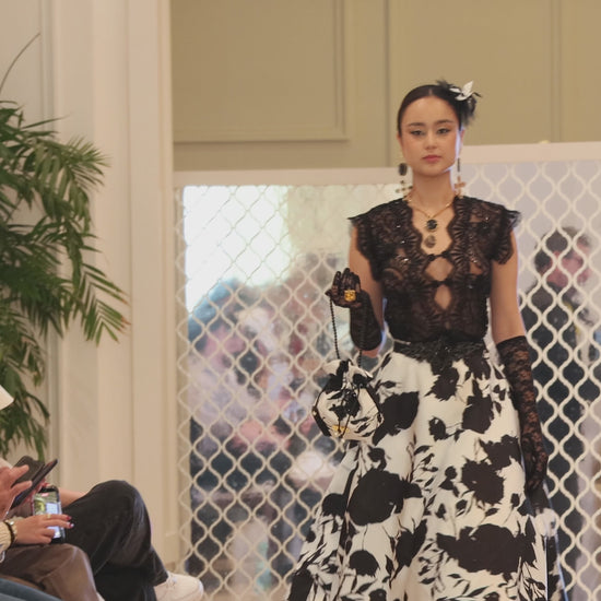 Presentada como pieza única en la Pasarela Española, esta blusa brocada se ha consolidado como uno de los diseños más emblemáticos de Majestad, ideal para editoriales, eventos exclusivos y estilismos que buscan impacto visual y sofisticación.