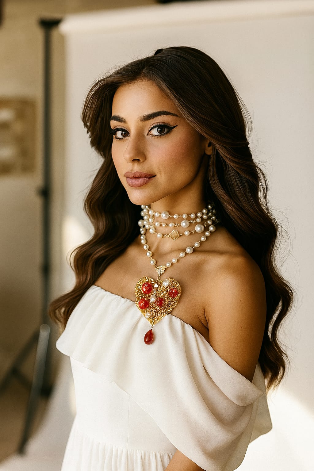 Cada pieza es una ofrenda a la feminidad poderosa, a la nostalgia que embellece, al lujo que emociona. No es solo un collar: es un poema que se lleva al cuello, una historia que transforma a quien la porta en diosa.