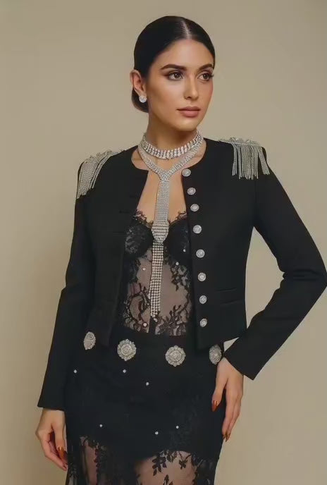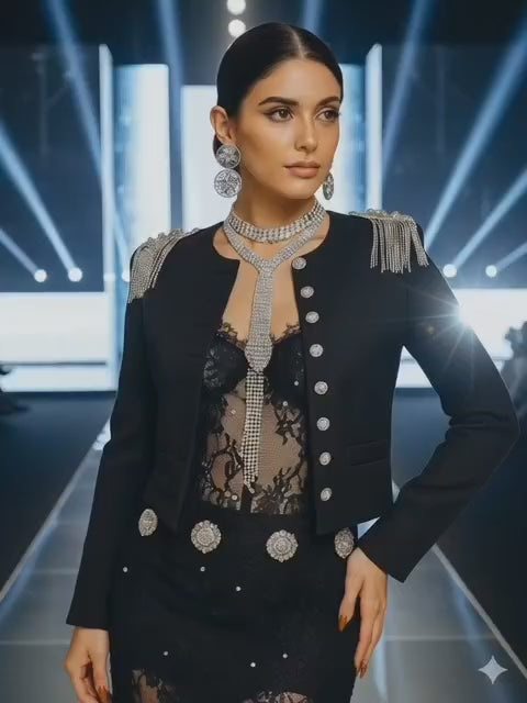 Conjunto Chaqueta Negra con Corset más Falda Con Encaje+ Joyería