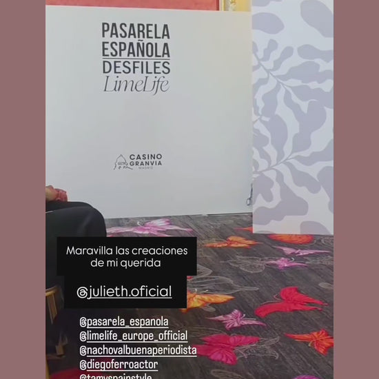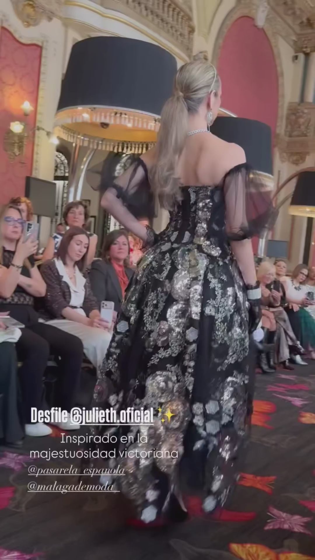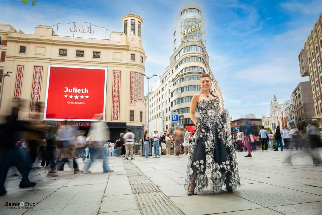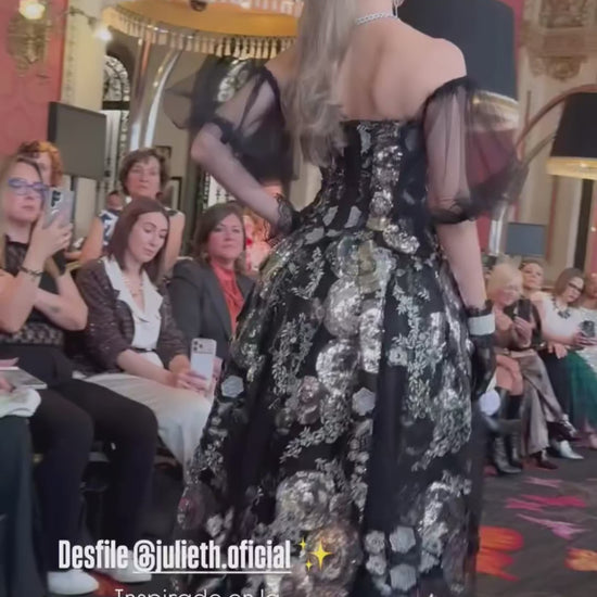 Esta pieza de alta costura de la firma Julieth, presentada en pasarela española, es una declaración de fuerza femenina envuelta en elegancia oscura. El diseño combina la profundidad del negro con bordados plateados de inspiración floral, creando un contraste que vibra entre lo etéreo y lo imponente.